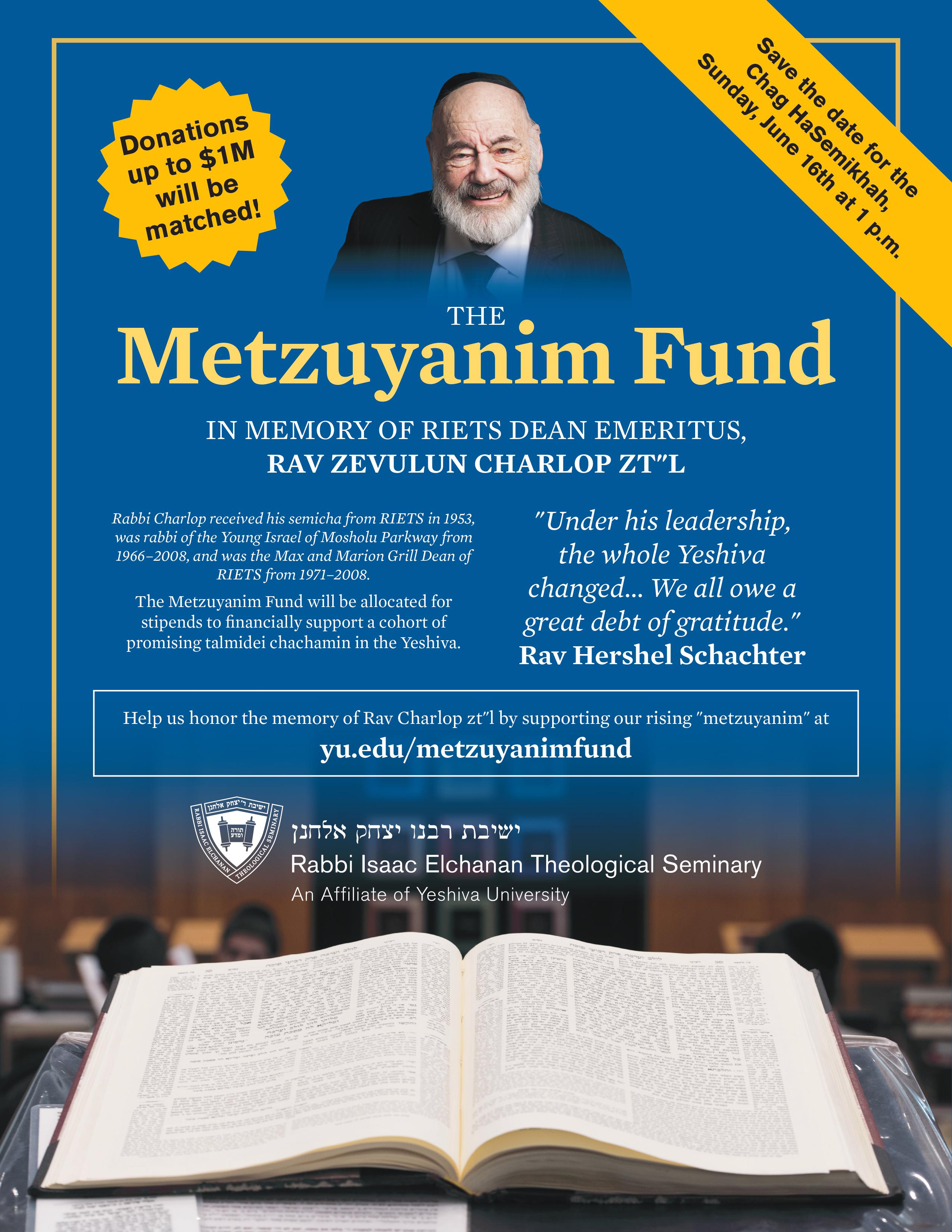 Our Dean Emeritus, Rabbi Zevulun Charlop Zt"l, was a pillar of the RIETS community for decades and aided countless talmidim (or, as he would say, "metzuyanim") on their path to becoming rabbanim. As we prepare to celebrate the Chag HaSemikhah, we are privileged to establish the Metzuyanim Fund in his memory to financially support a yearly cohort of promising talmidei chachamim learning in our kollel. Thanks to a generous donor, contributions will be matched up to $1 million! Please consider supporting our rising metzuyanim in order to continue the tradition of excellence and success in learning that Rabbi Charlop embodied. Donations can be made at https://ru.ahhcu.shop/MetzuyanimFund